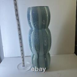 This stunning mid-century modern vase features a unique design with alternating bands of light and darker blue, accented with bubble inclusions. Its organic, bulbous form makes it a perfect statement piece for any modern decor collection. The vase is in excellent condition, with no visible cracks or chips.