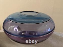 Fabulous and massive globular hand blown art glass bowl/vase by noted glass artist Robin Mix. Incredible incalmo technique with three bands of rich, gem-tone translucent colors in blue/green teal, sapphire blue, and pale amethyst. Signed to base Mix 1990.