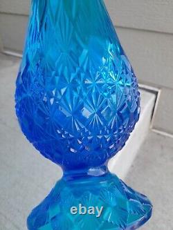This vintage mid-century modern Fenton glass vase is a beautiful addition to any collection. The sapphire blue color and Olde Virginia Swung design make it a unique piece that is sure to catch the eye. Manufactured in the United States during the 1960s, this vase is a great representation of the time period. It is perfect for display in any room and is sure to add a touch of retro charm. The vase is 20.5 inches tall and has no chips or cracks.